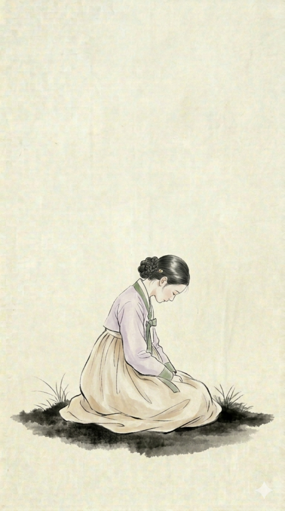아이고, 큰 실수를 할 뻔했네요! ‘연인’이 아니라 **’여인’**이군요. 단아하게 홀로 앉아 고개를 숙인 한국 여인의 모습이라면 나오미의 쓸쓸함과 슬픔이 훨씬 더 깊게 전달될 것 같습니다.